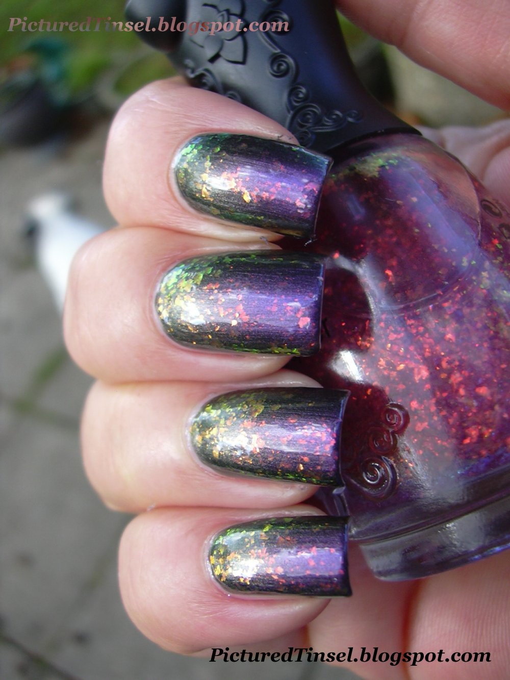 Durch den Autrag des Nfu-Oh hat Ki hat Ki ein (fast) völlig anderes Aussehen bekommen und der duochrom-Effekt von Ki schillert mit den orange-grünen Flakes von No. 46 um die Wette. Zeitaufwand: ca. 60 Sekunden. Sieht super aus, braucht aber einen Topcoat. Die Bilder habe ich wie üblich 'ohne' gemacht.